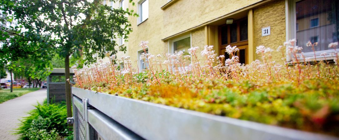 Ein Bestandteil der Strategie von spar+bau sind Gründächer auf den Müll- und Fahrradhäusern unserer Immobilien: „Gründächer verbessern das Mikroklima. Sie schaffen Lebensräume für Pflanzen und Tiere, binden Staub und Schadstoffe und senken die CO₂-Belastung“, erklärt Lea Brüggemann. „Zudem haben sie eine temperaturisolierende Wirkung, die sowohl im Sommer als auch im Winter von Vorteil ist.“ spar+bau setzt auch bei einigen umliegenden Grünflächen auf extensive Pflege, wenn es sich anbietet. „Wir mähen nur zwei- bis dreimal im Jahr und überlassen die Flächen ansonsten sich selbst.“ Dadurch können Wildblumenwiesen entstehen, die Lebensraum für Tiere bieten. „Im Herbst lassen wir Laub in Beeten und Strauchflächen liegen, was Tieren wie Igeln als Winterquartier dient und den Boden sowie Pflanzen vor Kälte schützt.“ Bei der Bepflanzung legt spar+bau Wert auf klimaresistente Pflanzen – einer Mischung aus heimischen und nicht heimischen Baumarten –, um Flora und Fauna langfristig anzupassen. „Wir überwachen unseren Baumbestand extern, um die Verkehrssicherung und den Bestandsschutz zu gewährleisten.“