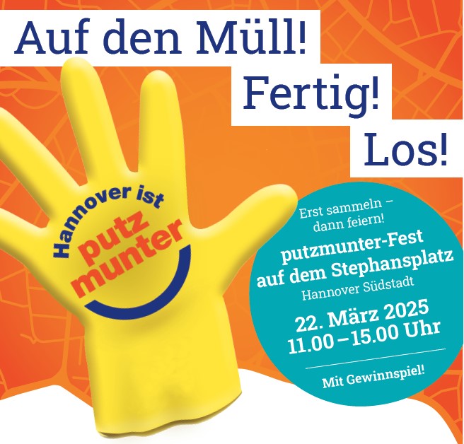 Frühlingszeit ist putzmunter-Zeit. Unter dem Motto: „Auf den Müll! Fertig! Los!“ startet am Samstag, 22. März, der diesjährige große Frühjahrsputz. Die Landeshauptstadt Hannover, unter der Schirmherrschaft vom Ersten Stadtrat und Finanz- und Ordnungsdezernenten Axel von der Ohe und die Abfallwirtschaft Region Hannover (aha) laden ganz Hannover ein, bei der 19. Ausgabe von „Putzmunter“ dabei zu sein.