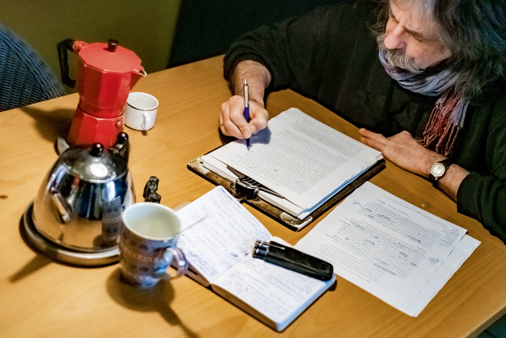 WH: Am Ende geht einer von uns noch mal komplett drüber, bevor es an den Verlag geht, damit es stilistisch aus einem Guss ist. Und danach lesen wir es zusammen laut vor – dafür kommen wir ja vom Theater. Dann kriegt man ein Gespür dafür, ob es funktioniert. Er nimmt den knallroten Espressokocher vom Herd und gießt mir einen Kaffee mit Mandelmilch ein.