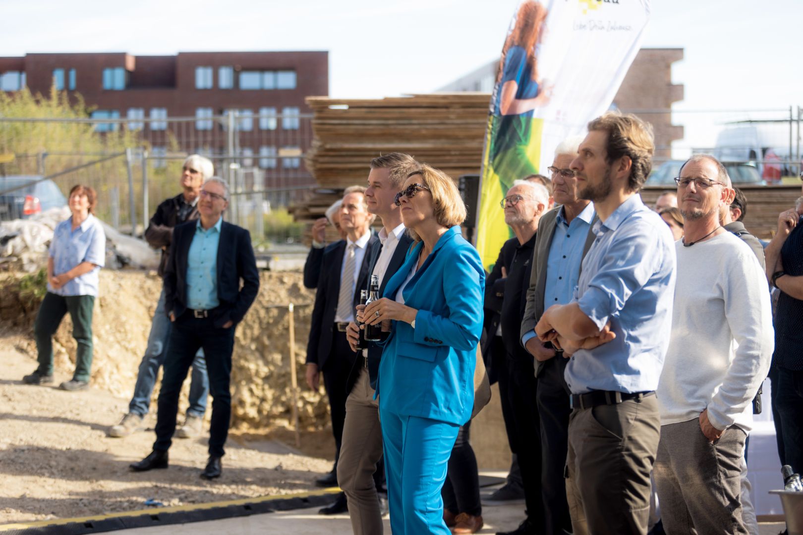 ... und für alle Geldbeutel und Geschmäcker. Der Spar- und Bauverein erhielt auch viel Lob dafür, dass er, in Zeiten großer Wohnungsnot, die Hälfte der Mietwohnungen bei diesem Pro- jekt als öffentlich geförderte Wohnungen zur Verfügung stellt: 22 Sozialwohnungen mit Landesförderung und weitere 22 mit der Förderung der Landeshauptstadt Hannover. „Hier entsteht Wohnraum, den wir so dringend brauchen“, erklärte Stefanie Nöthel, Abteilungsleiterin Städtebau und Wohnen im Nieder- sächsischen Ministerium für Umwelt, Energie, Bauen und Klima- schutz, in ihrer Rede: „Noch ist nicht alle Arbeit getan, aber das Richtfest heute ist ein wichtiger Meilenstein für das Vorhaben von spar+bau. Dafür sind gerade in dieser Zeit ein großer Wille und ein großes Engagement erforderlich, für das ich dem Spar- und Bauverein, auch im Namen des Landes Niedersachsen, sehr herzlich danken möchte.“ Jede einzelne geförderte Wohnung habe die Mietpreisbremse bereits eingebaut – eine wichtige Komponente für den gesellschaftlichen Zusammenhalt. Doch auch der Quadratmeterpreis bei den nicht geförderten Wohnun- gen ist mit durchschnittlich 11,50 Euro sehr moderat.