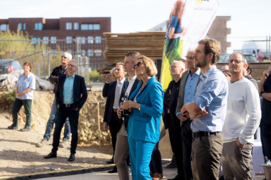 Rund 120 Gäste aus Politik, Wohnungswirtschaft, Finanz- und Bauwesen kamen zusammen, um das Richtfest des zweiten Neubauprojektes von spar+bau auf dem Baufeld 9 zu feiern. Hier entstehen nun weitere 89 attraktive Mietwohnungen für Hannover – bestehend aus Zwei-, Drei- und Vier-Zimmer-Einheiten mit Balkon oder Terrasse. Die Größen der barrierefreien Wohnungen variieren zwischen 42 und 109 Quadratmetern. Ein Highlight sind die großzügigen Grundrisse der Vier-Zimmer-Wohnungen, die zwei Balkone haben. Die Einzelhäuser des Komplexes im Effizienzhaus-Standard 55 sind vollunterkellert und über eine gemeinsame Tiefgarage verbunden, die teilweise Lademöglichkeiten für E-Mobilität vorsieht.