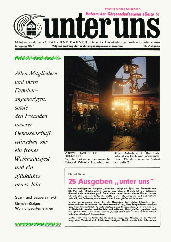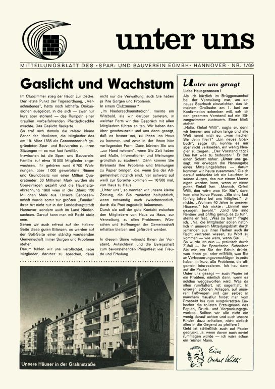 Erstausgabe der „unter uns“: Das 4-seitige „Mitteilungsblatt“ gilt als sachliche Informationsquelle. Es erscheint zweimal jährlich. Der Spar- und Bauverein eGmbH Hannover hat 16.500 Mitglieder in 6.700 Wohnungen (heute sind es mehr als 27.400 Mitglieder und rund 8.100 Wohnungen).