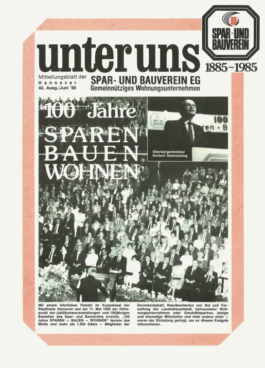 Die Genossenschaft feiert im Mai 1985 den hundertsten Geburtstag! Mit 1.200 geladenen Gästen ist die spar+bau-Familie im Kuppelsaal der Stadthalle Hannover ganz „unter sich“.