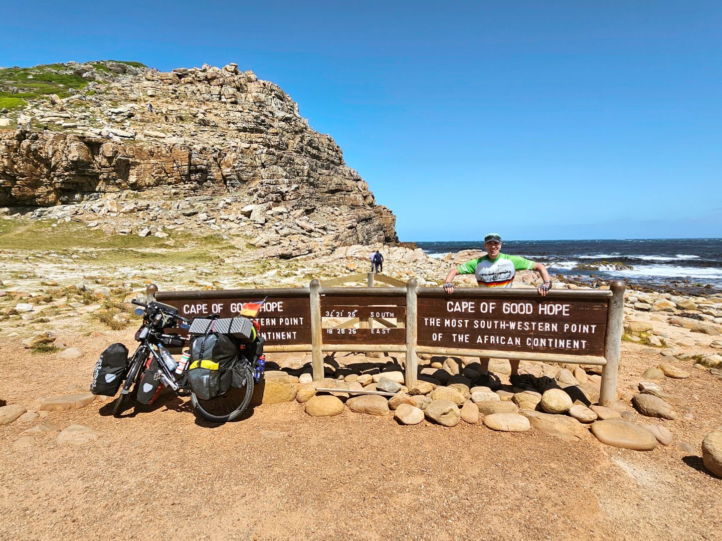 Er stellte sich als ehemaliger südafrikanischer Botschafter in Botswana und Belgien heraus, der noch Staatsbesuche mit Nelson Mandela organisiert hatte. Ein anderes Mal lud ihn jemand ein, für fünf Tage sein Gast in Kapstadt zu sein. Abends saßen sie auf seinem Balkon mit dem Blick auf den Tafelberg. „Mit dem Fahrrad hatte ich immer einen Türöffner. Das hat es mir einfacher gemacht, Kontakt zu bekommen.“ In Südafrika am Nordkap besuchte er dann noch das leider wenig spektakuläre Städtchen Hanover. Von Kapstadt ging es nach Namibia, wo er bei 30 Grad Weihnachten feierte und in einer deutschen Kneipe ganz traditionell Knödel, Rotkohl und Weihnachtsgans aß.