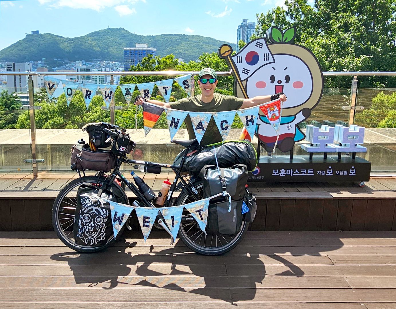 Über Australien – wo es permanent regnete – ging es weiter nach Südkorea. Dort überrasch- te ihn die Radfahrerfreundlichkeit – mit einem landesweiten Radfernwegnetz ohne Autoverkehr. Er bekam ein kleines Heft, für das es Stempelstellen für Radfahrer im gesamten Land gibt, und eine Medaille für die gefahrenen Kilometer. Und auch Japan ist ein radlerfreundliches Land. Sein letzter Aufenthalt in Asien war Hannovers Partnerstadt Hiroshima. Dort empfing ihn eine Delegation im Friedenspark. Ein gebührender Abschluss, bevor es von Tokio aus zurück nach Europa ging.