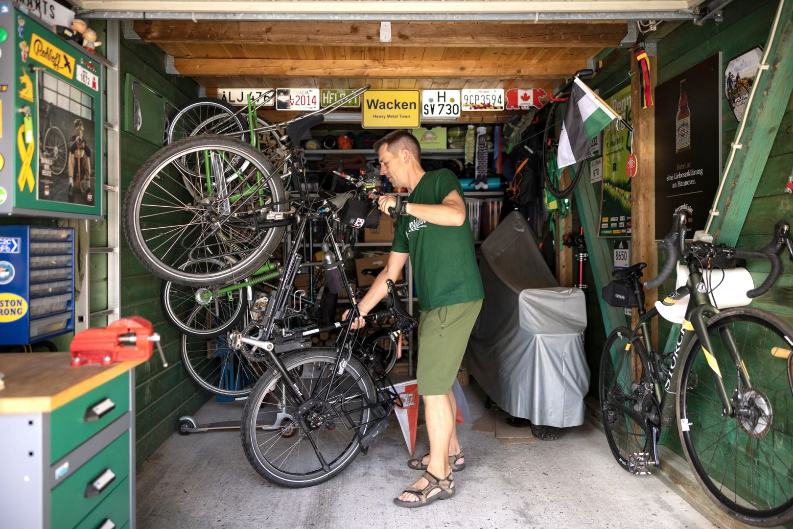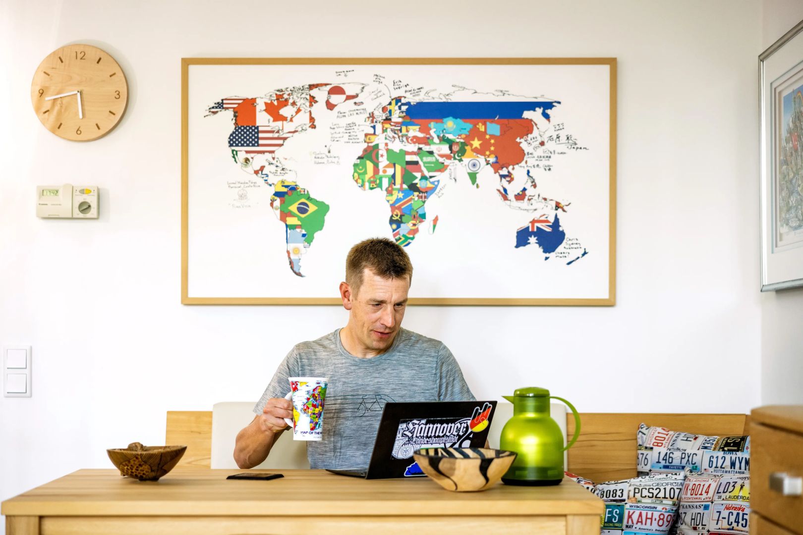 Radreisende, gastfreundliche Menschen sind weltweit unter warmshowers.org verbunden. Andreas Beneke hat das Angebot auf seiner Reise vielfach genutzt und bietet sich auch selbst gern als Gastgeber an. Die Weltkarte an der Wand zeigt die Namen seiner Besucher aus aller Welt.