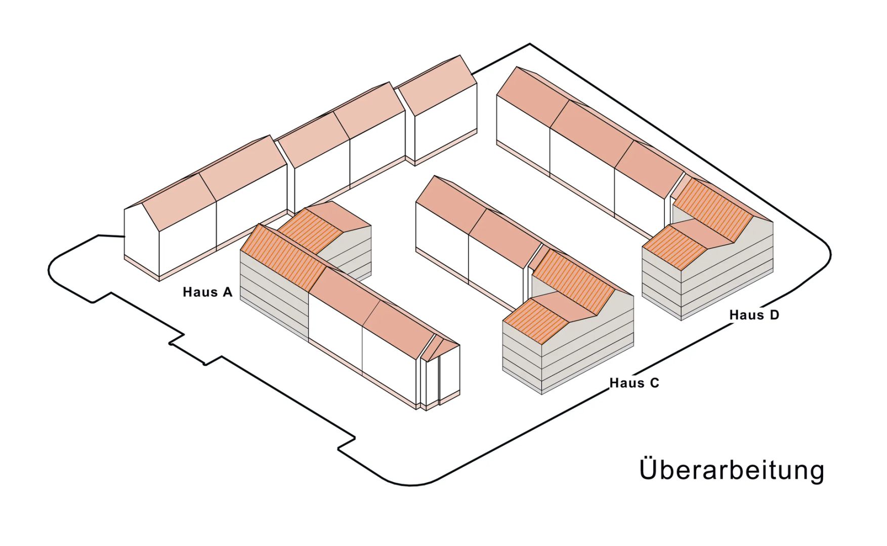 Und nach dieser Entscheidung? Jedenfalls kein Ende der von uns geforderten konzeptionellen Überarbeitungen. Neben den vielen Optimierungen der Wohnungsgrundrisse und erfolgreicher Prüfung auf Entfall eines kostspieligen Kellers prüften wir noch die Anregung aus dem Wettbewerb, ursprünglich vorgesehene Abstände zu den Neubauten auf dem Tankstellengrundstück kurzerhand baulich aufzufüllen. Dadurch wurde es möglich, ohne Wohnflächenverlust auf ein im Zuge der Nachverdichtung vorgeschlagenes Gebäude ganz zu verzichten, da die Abstände zu den bestehenden Gebäuden recht gering gewesen wären. So konnten wir die Wohnqualität im Bestand sichern und gleichzeitig größere Wirtschaftlichkeit durch bessere Auslastung der geplanten Treppenhäuser und Aufzüge bei den Neubauten erreichen. Was will man mehr?