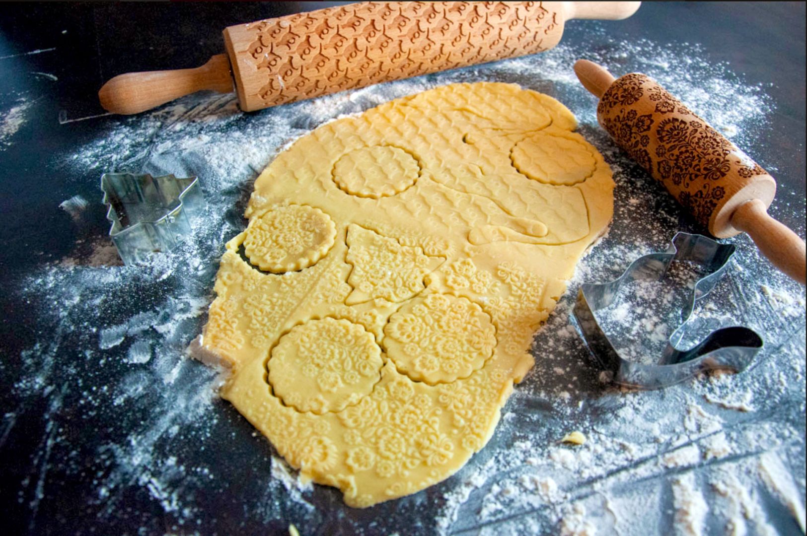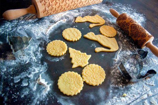 3. Den Backofen auf 180°C Ober-/Unterhitze vorheizen. Den Teig auf einer bemehlten Arbeitsfläche ausrollen. Zum Prägen die Teigoberfläche ebenfalls bemehlen und die Prägerolle mit leichtem Druck von der Mitte nach außen über den Teig rollen. Anschließend die Plätzchen mit Formen nach Wunsch ausstechen und auf ein mit Backpapier belegtes Blech legen. Für ca. 10 Min. (evtl. etwas länger) im Ofen goldbraun backen und anschließend auf einem Gitter abkühlen lassen.