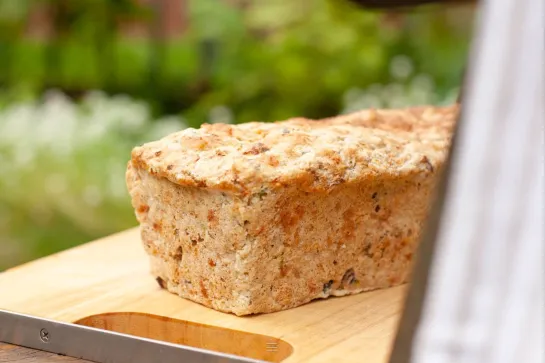 - Das Brot auf der mittleren Schiene für ca. 30–40 Minuten im Ofen backen. Anschließend das Brot in der Backform auf einem Gitter ca. 15 Minuten auskühlen lassen. Dann erst aus der Form stürzen und vollständig auskühlen lassen.