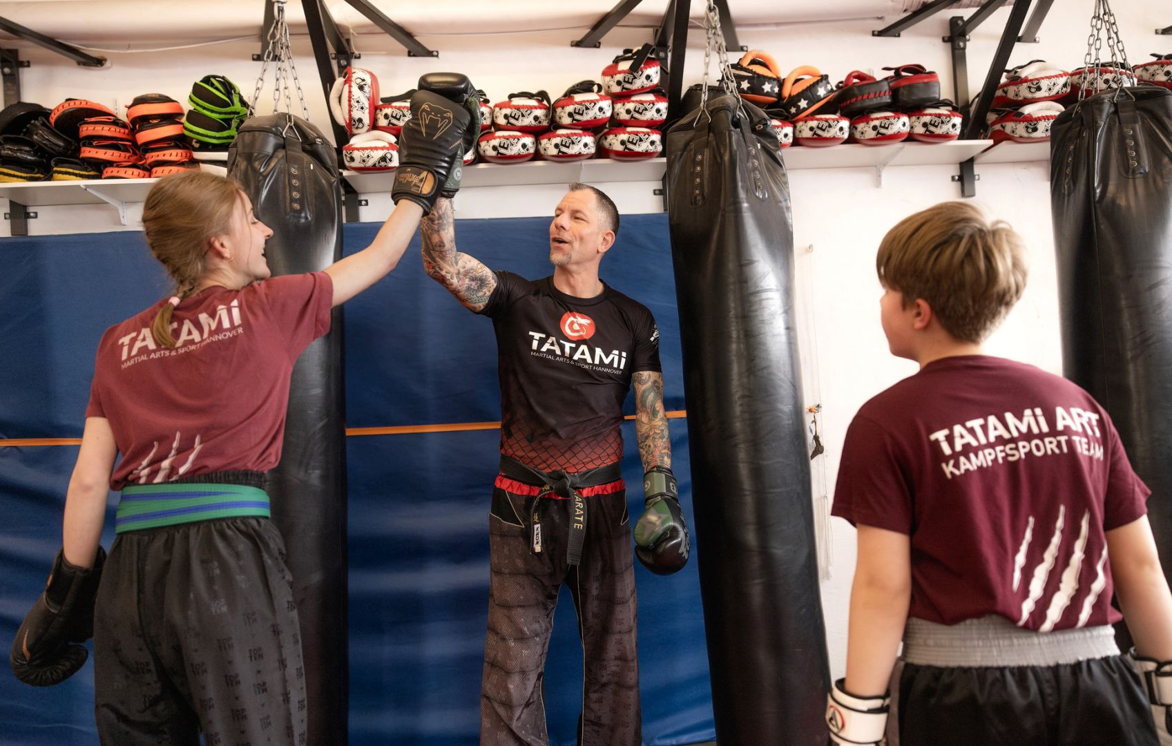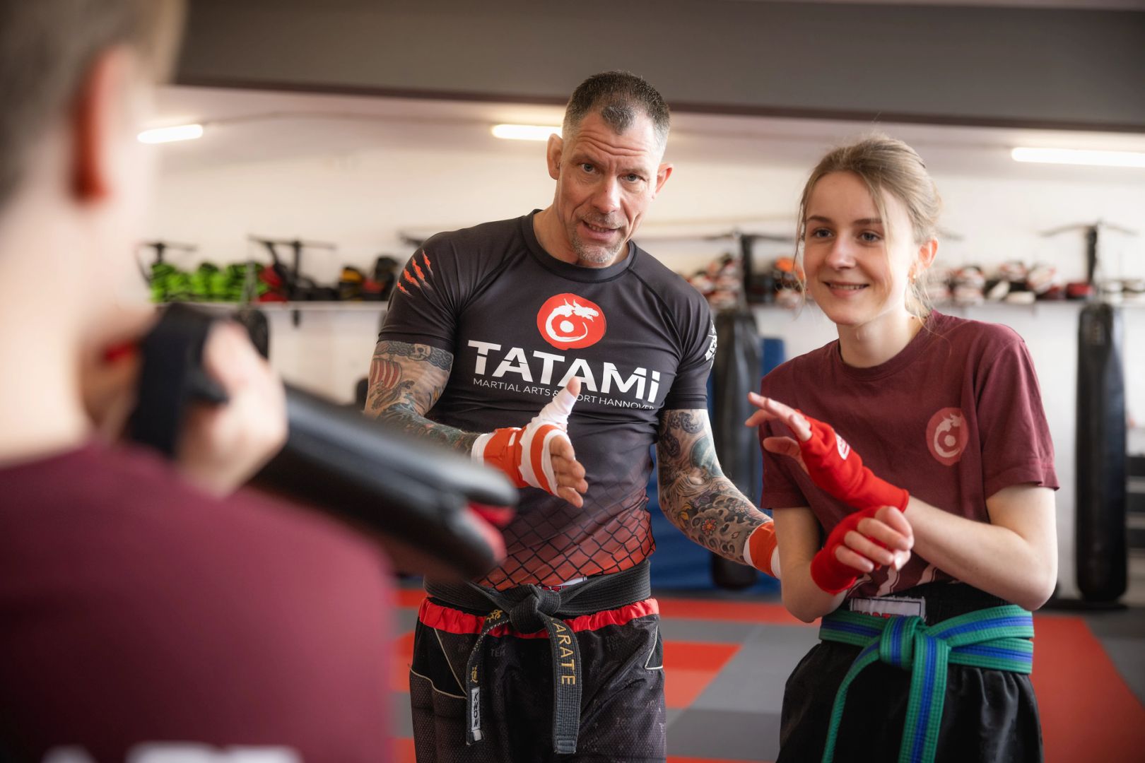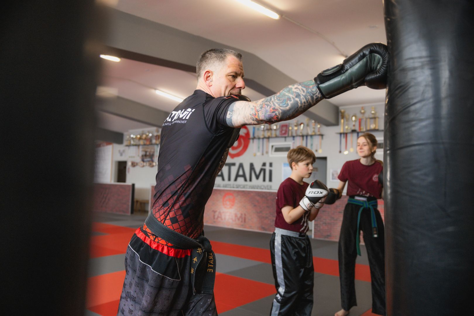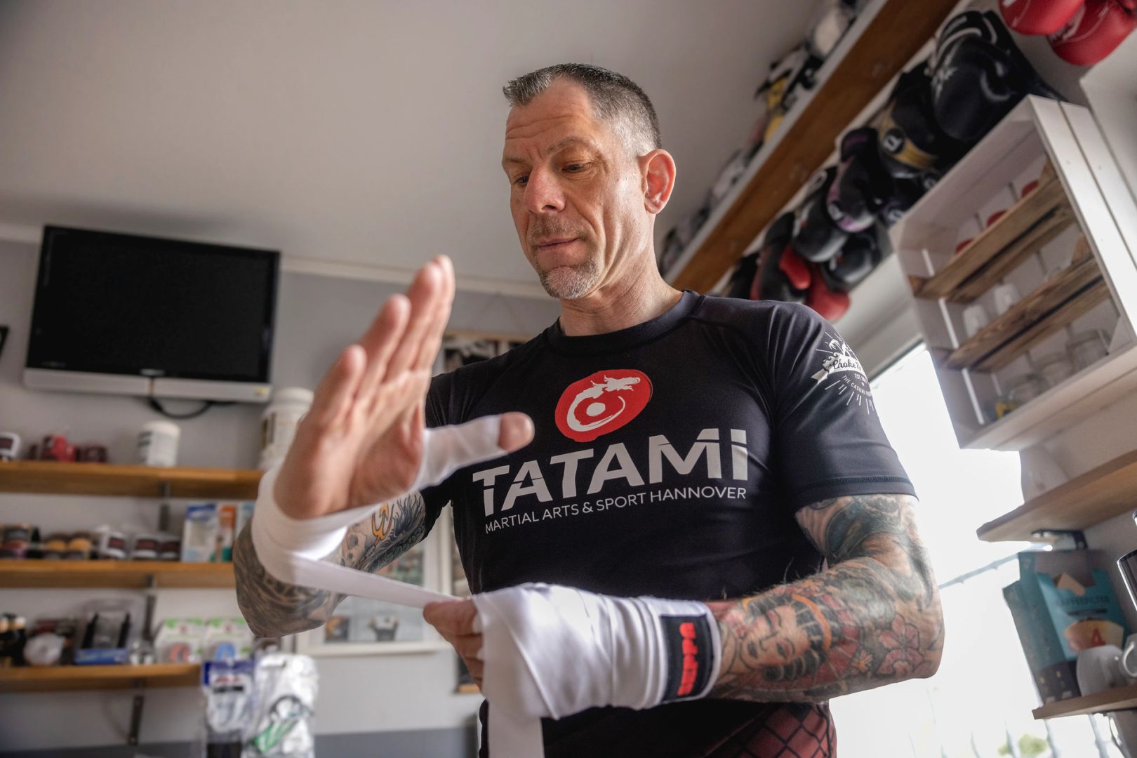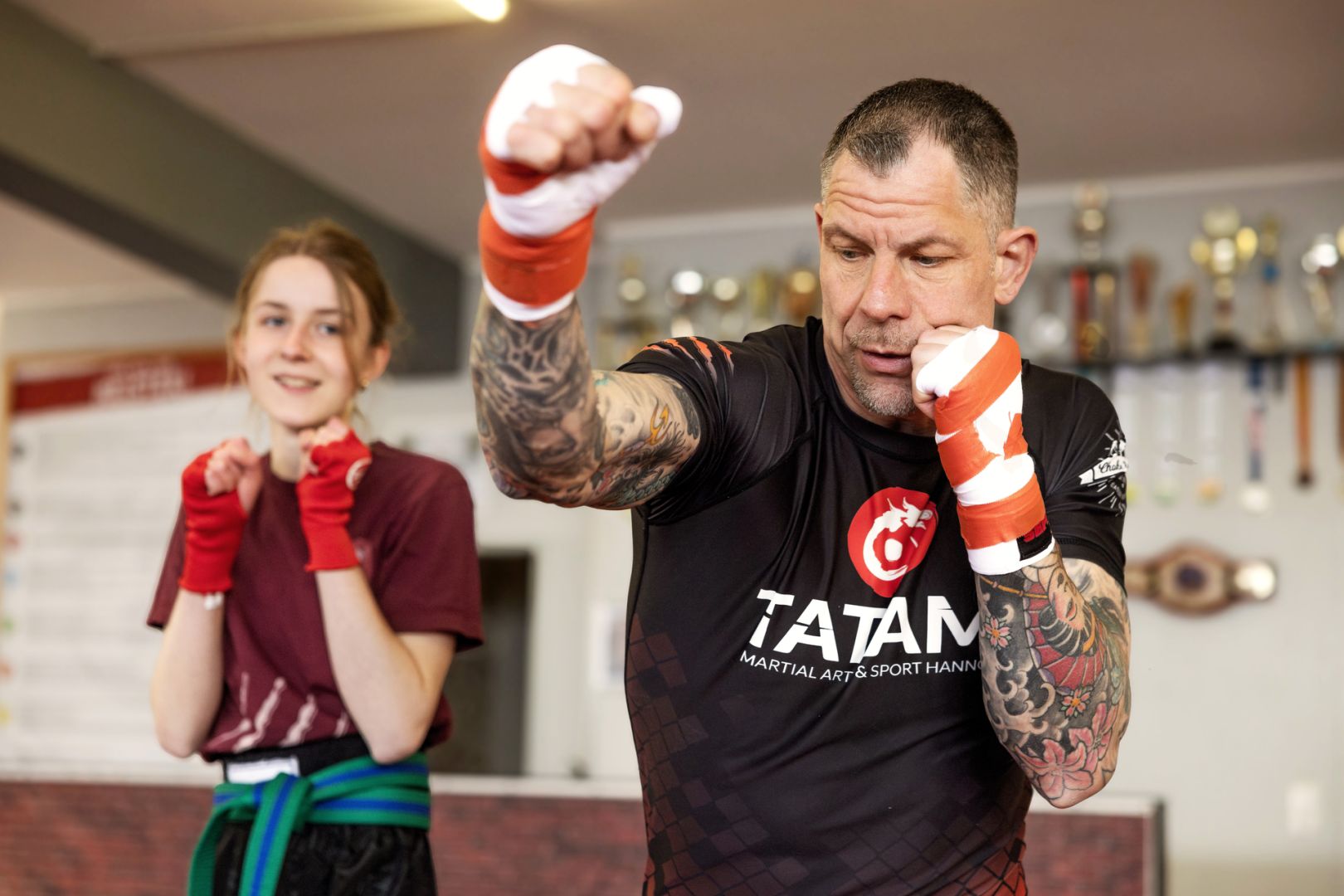 Über dem Eingang des Kampfsportvereins Tatami Martial Arts & Sport Hannover hängt ein großes rot-weißes Schild mit dem Vereinslogo: ein sich um (s)einen Mittelpunkt drehender Drache. So dynamisch, als wäre er jederzeit kampfbereit. Manfred Boyd-Carta, der 1. Vorsitzende und Mitgründer des Vereins, führt durch die Trainingsräume. Hier lernen derzeit 650 Mitglieder im Alter von drei bis 60 Jahren Kickboxen, Thaiboxen, Boxen, MMA (Mixed Martial Arts), Yoga, Selbstbehauptung, Selbstverteidigung und Fitness. Auf den Regalen an der Wand stehen unzählige Pokale – allesamt Trophäen für diszipliniertes Training und ehrlich erkämpfte Siege auf nationaler und internationaler Bühne.