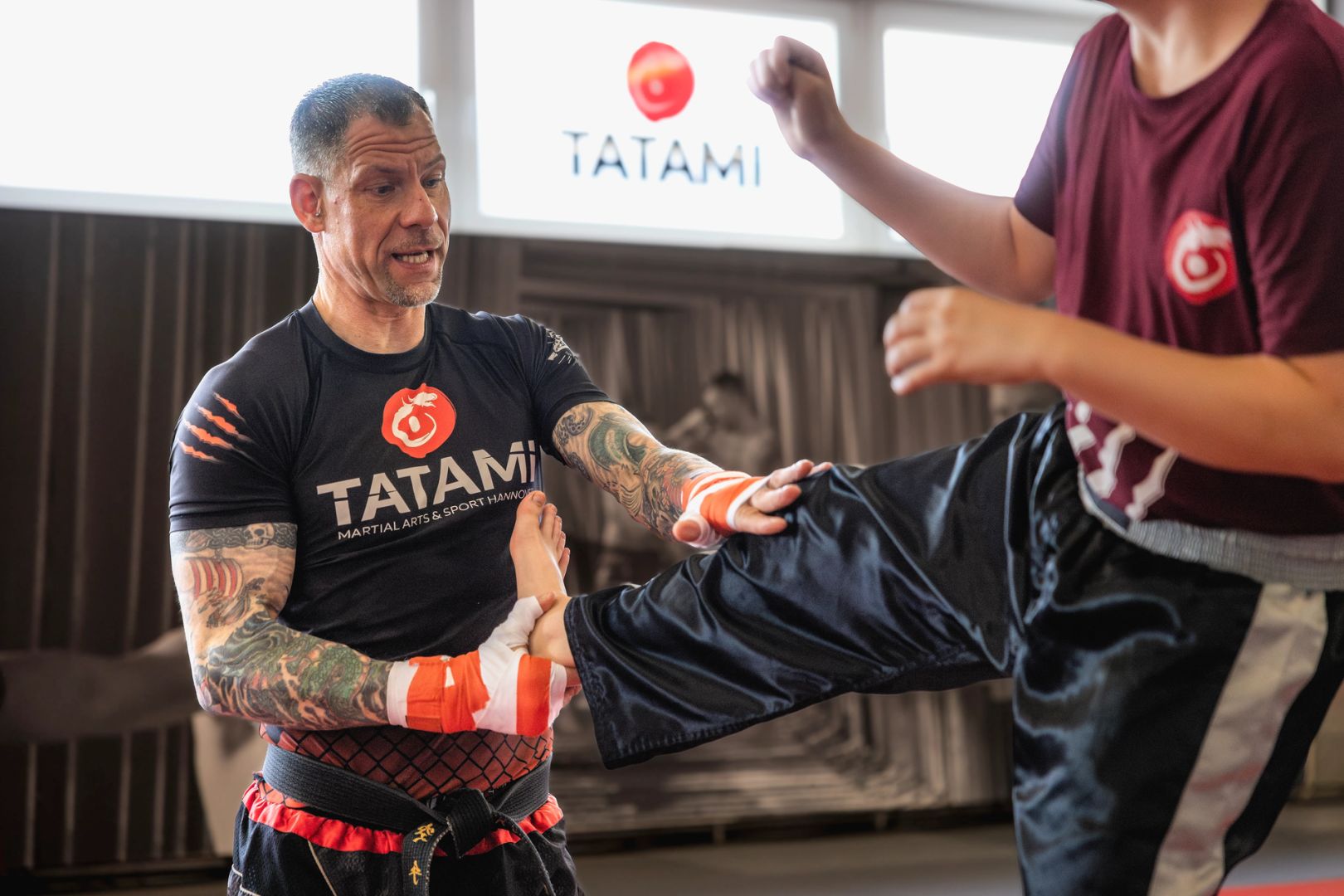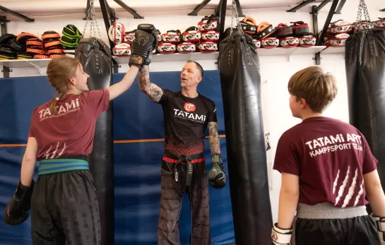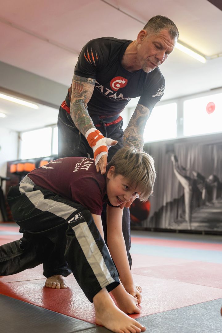 „Das Tatami ist ein familiärer Ort“, erklärt Boyd-Carta das Konzept, mit dem er und sein elfköpfiges Team sich seit mehr als zehn Jahren in der Vereinswelt einen Namen machen. Manni, so nennen alle den Cheftrainer, berichtet, dass sie auch 1.000 Mitglieder mehr haben könnten. Doch das entspräche nicht ihrer Philosophie. Hier zähle der Mensch, mit all seinen Stärken und Schwächen, nicht der Profit. „Wer den Verein betritt, bekommt Werte vermittelt. Wir sind offen für unser Gegenüber und begegnen uns mit Respekt. Egal ob Millionär, arm wie ’ne Kirchenmaus oder Menschen mit Handicap. Wir sind alle gleich, deshalb tragen wir auf der Matte unsere Tatami-Trikots“, betont der ehemalige Erzieher. Aus seiner 20-jährigen Erfahrung in einem inklusiven Kinderladen weiß der 52-Jährige, dass Menschen mit Beeinträchtigungen ganz selbstverständlich in eine Gruppe integriert werden können. Jeder trainiere im Rahmen seiner Möglichkeiten, da käme es dann nicht auf perfekte Schlag- und Tritttechniken an, sondern auf den Spaßfaktor, auf das Teilhaben. „Wer nicht ganz so beweglich oder schnell ist, wird beim Training ‚mitgenommen‘.“ Das Familiäre sei nicht in jedem Verein so, erklärt Manni. Zudem freut er sich darüber, dass immer mehr Mädchen und Frauen in den Verein eintreten, um Kampfsport zu lernen.