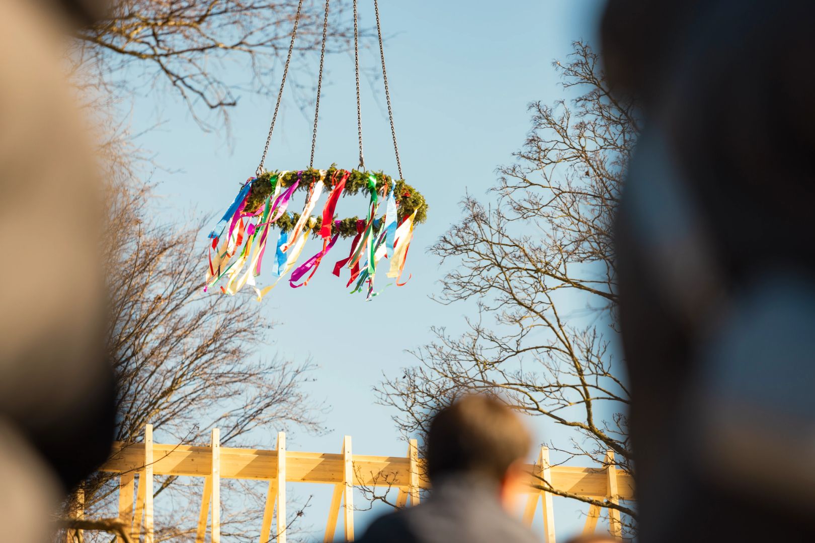 Für die feierliche Rede beim Richtfest stieg spar+bau-Vorstand Rainer Detjen auf das Gerüst des Rohbaus und bedankte sich herzlich bei allen Beteiligten. Detjen lobte den reibungslosen Baufortschritt und den gelungenen Entwurf: „Grundlegende Idee des Gebäudes ist die Laubengangerschließung, sodass dort Kommunikationsflächen entstehen. Denn das ist es ja, was eine Genossenschaft ausmacht: das Gemeinsame, das Miteinander, das Zueinanderfinden.“