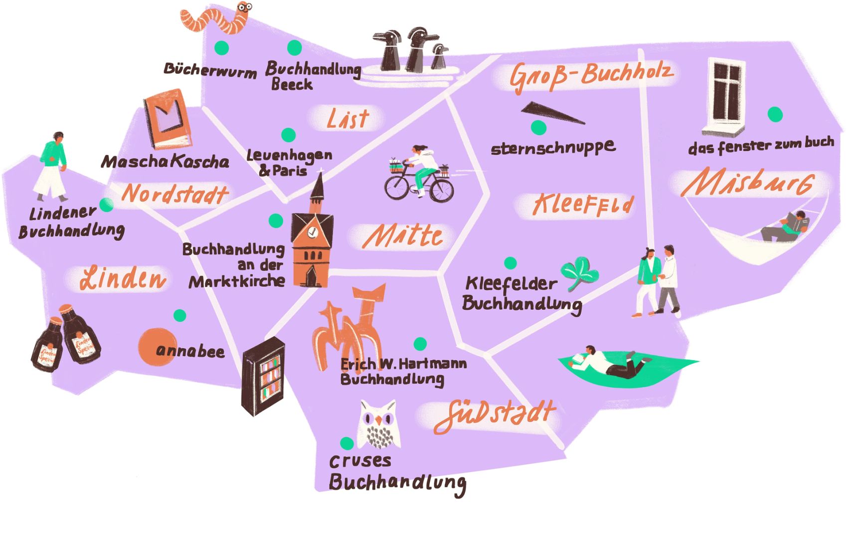 Hannovers kleine, inhabergeführte und preisgekrönte Buchhandlungen bereichern das kulturelle Leben. Sie sind Treffpunkte, Kulturorte und Schatzkammern für Lesefans. Ob in Buchholz, der List, Nord- und Südstadt, in Linden oder mitten in der City: Jede dieser Buchhandlungen hat ihren ganz eigenen Charme. Wer hier einkauft, stärkt die Vielfalt im Buchmarkt, erhält Arbeitsplätze und belebt Stadtteile.
