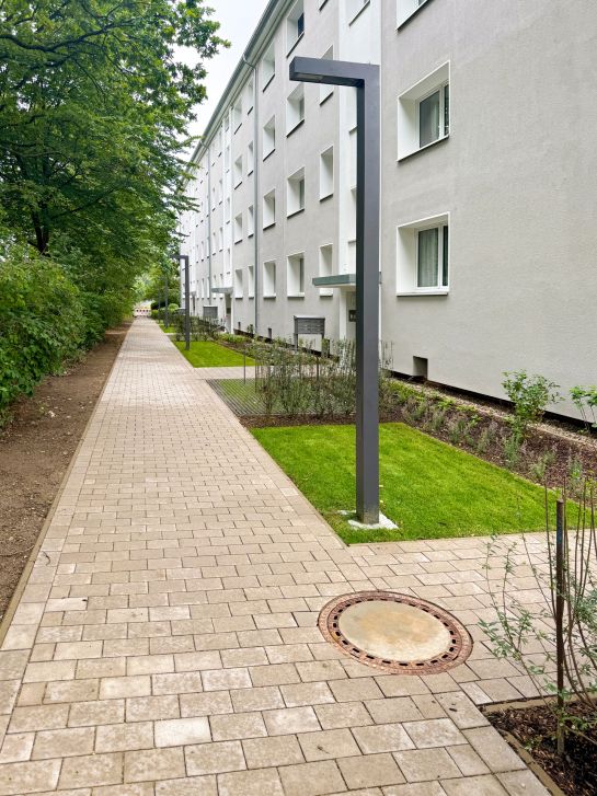 In Wettbergen folgten nach der energetischen Sanierung der Gebäude und dem Einbau der Erdwärmesonden im ersten Bauabschnitt umfangreiche Arbeiten an den Außenanlagen: In den Vorgärten der Häuser Rudolfstraße 1–5 und In der Rehre 55–59 wurden die Regen- und Schmutzwasserleitungen erneuert. Neue Hauszuwegungen, Fahrradabstellflächen, Briefkästen, Mastleuchten, ein weiteres Rollatorhaus sowie ein vergrößerter Müllplatz ergänzten die Maßnahme. Auch die Stellplätze, Gehwege und Grünflächen mit Stauden, Rasen und neuen Gehölzen wurden neu gestaltet. Im November 2025 begann der zweite Bauabschnitt an den Häusern In der Rehre 47–53. Auch hier wurden die Regen- und Schmutzwassergrundleitungen der Häuser 51 und 53 erneuert und es wurde eine Zisterne zur Bewässerung eingebaut. Zudem wurden Leitungen für Beleuchtung und Glasfaser verlegt. Hier wie in den Häusern 47 und 49 gehen die Maßnahmen in diesem Frühjahr weiter.